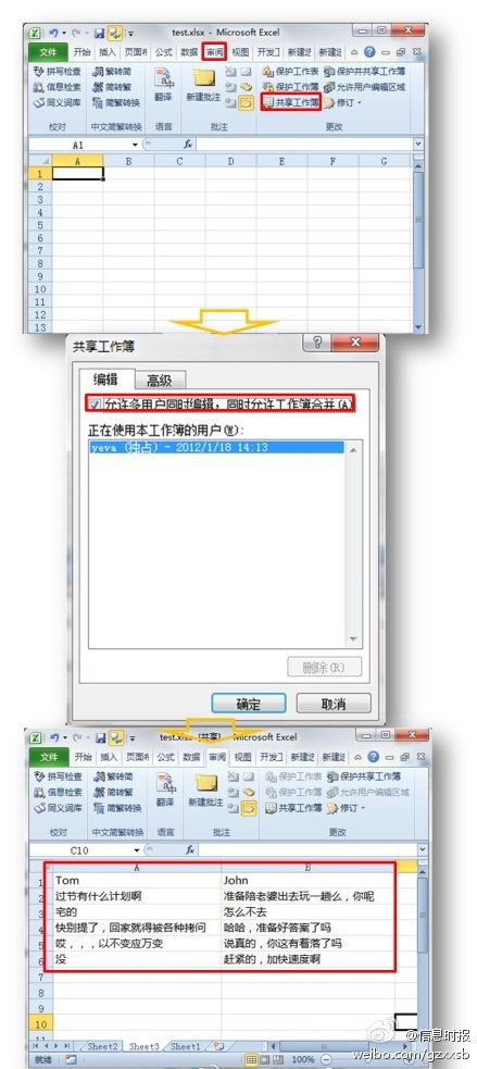局域网用Excel 既可以聊天又可以协同工作!单击“审阅”-“共享工作薄”-“允许多用户同时编辑,同时允许工作薄合并”-“确定”,再将此Excel放入共享平台即可多方输入并收到Excel更新内容。Boss们以为干掉QQ、MSN就没法聊天了?