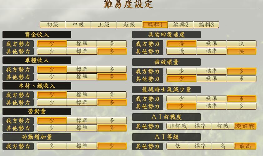 自选难度,应该是游戏里最高难度的设置了,有史有寿无姬武将,虽然有史,也只做了第一个战国传无损拿了一个长尾家一个城,之后都没按剧本套路走……