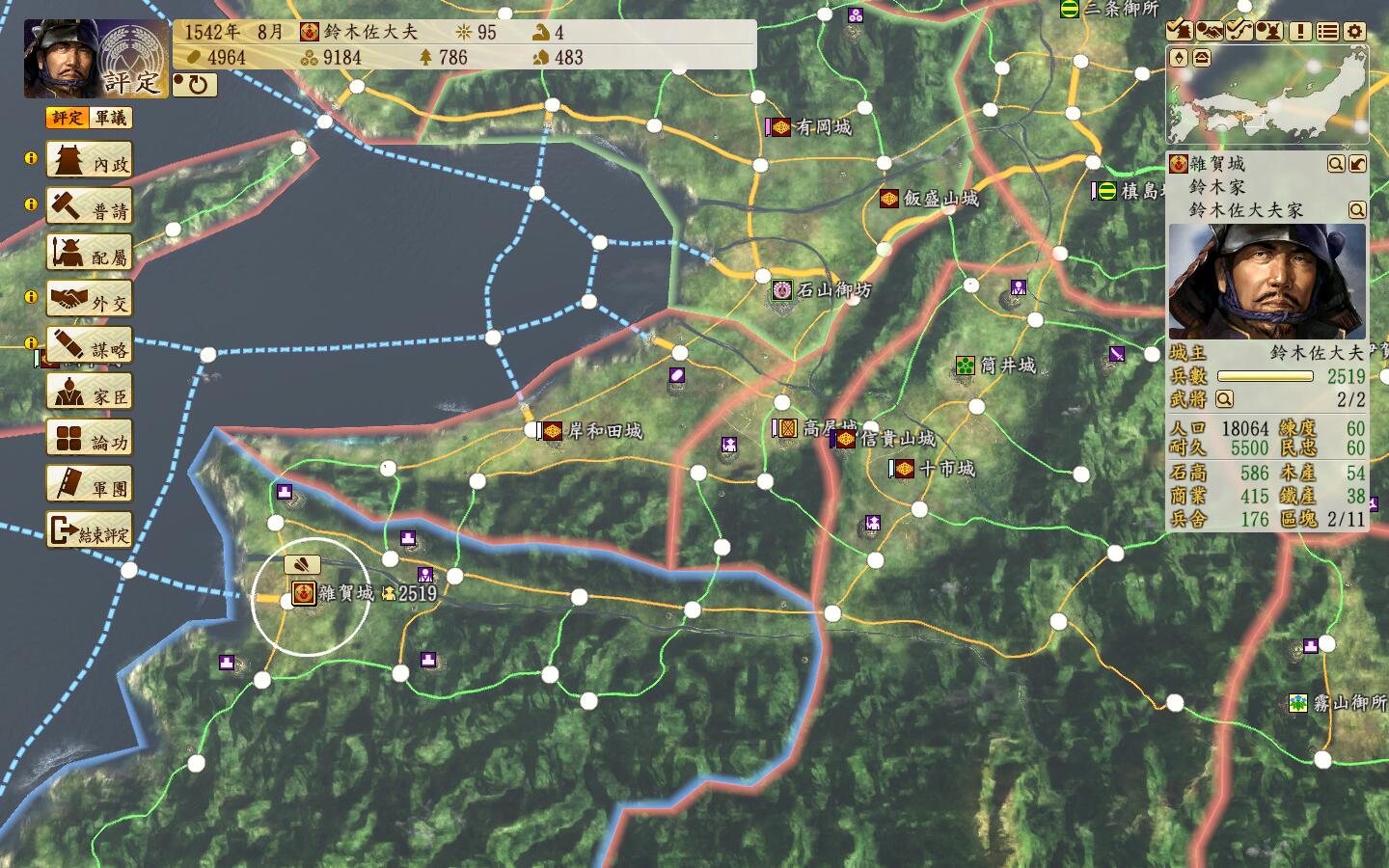 1542年8月,铃木家就2个将,佐大夫还能用用,勇将射击特化,手下那个谁就凑数的,城防还算高,还有最重要是自带3支佣兵国人众