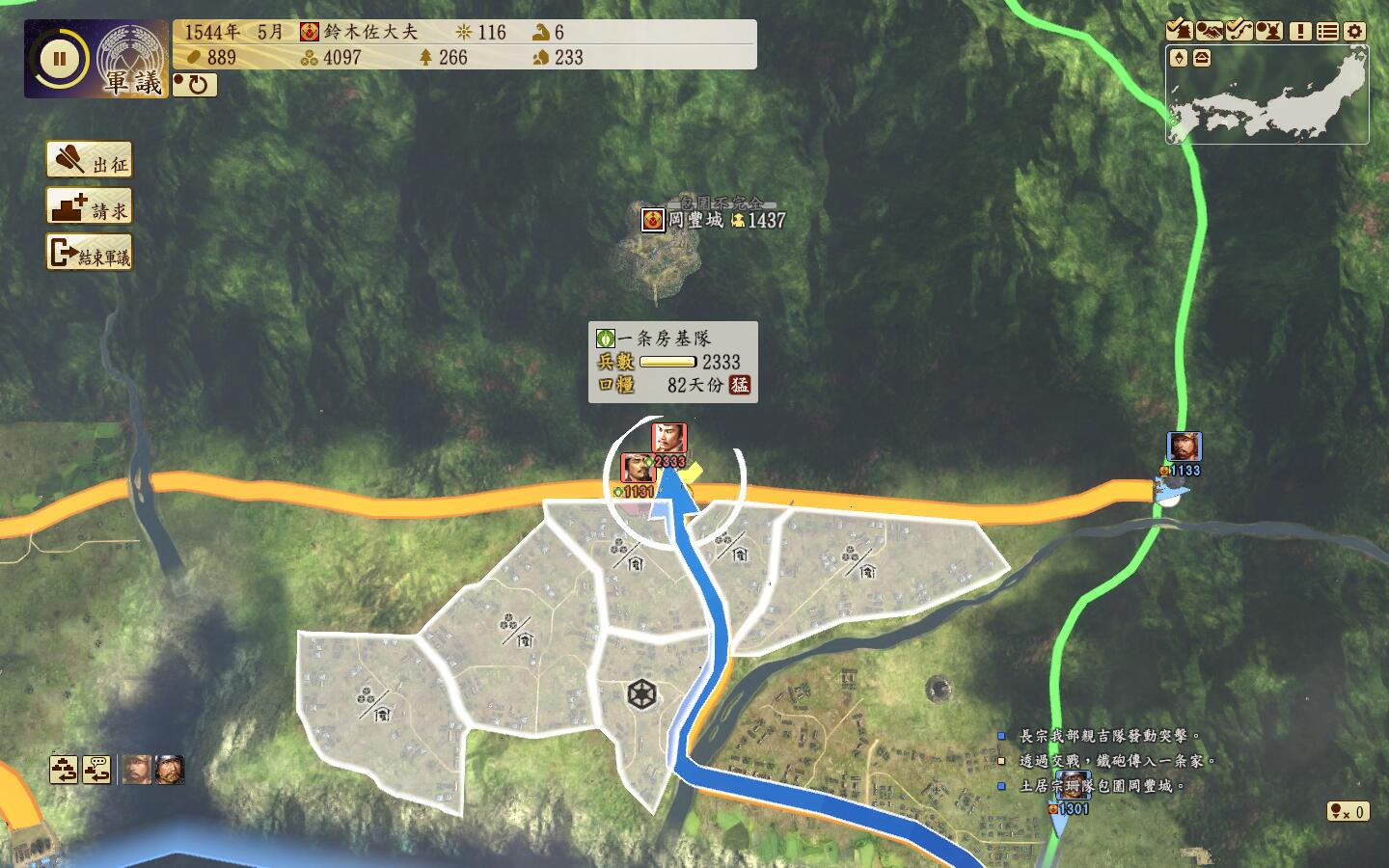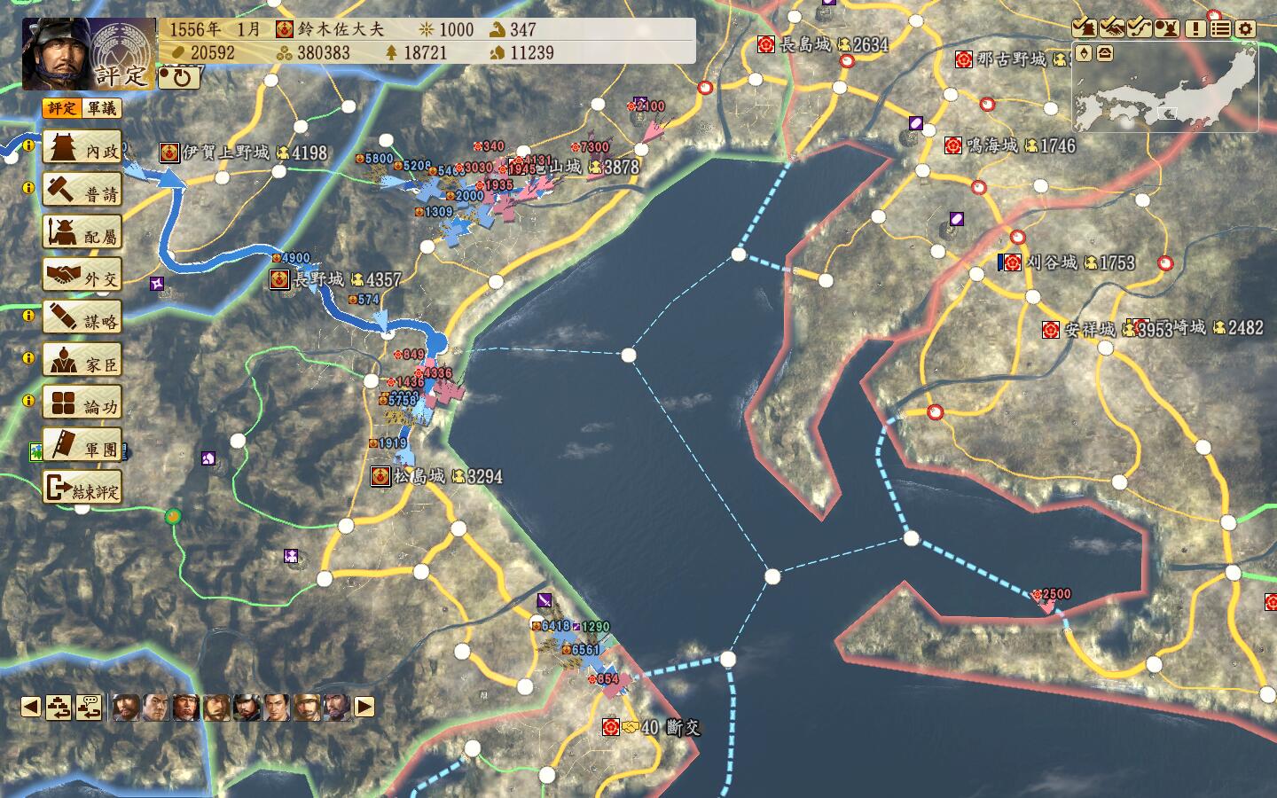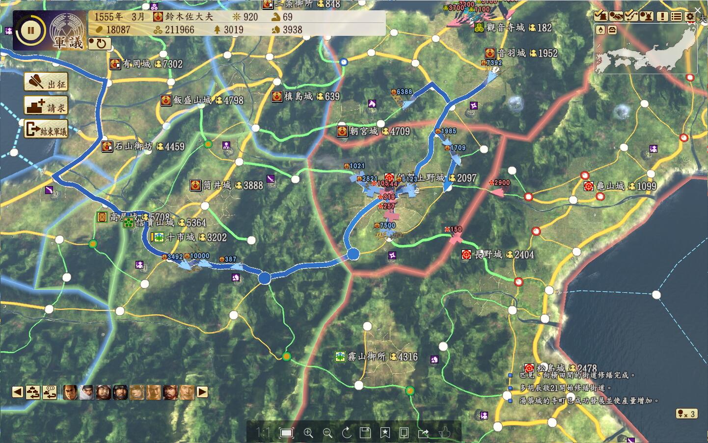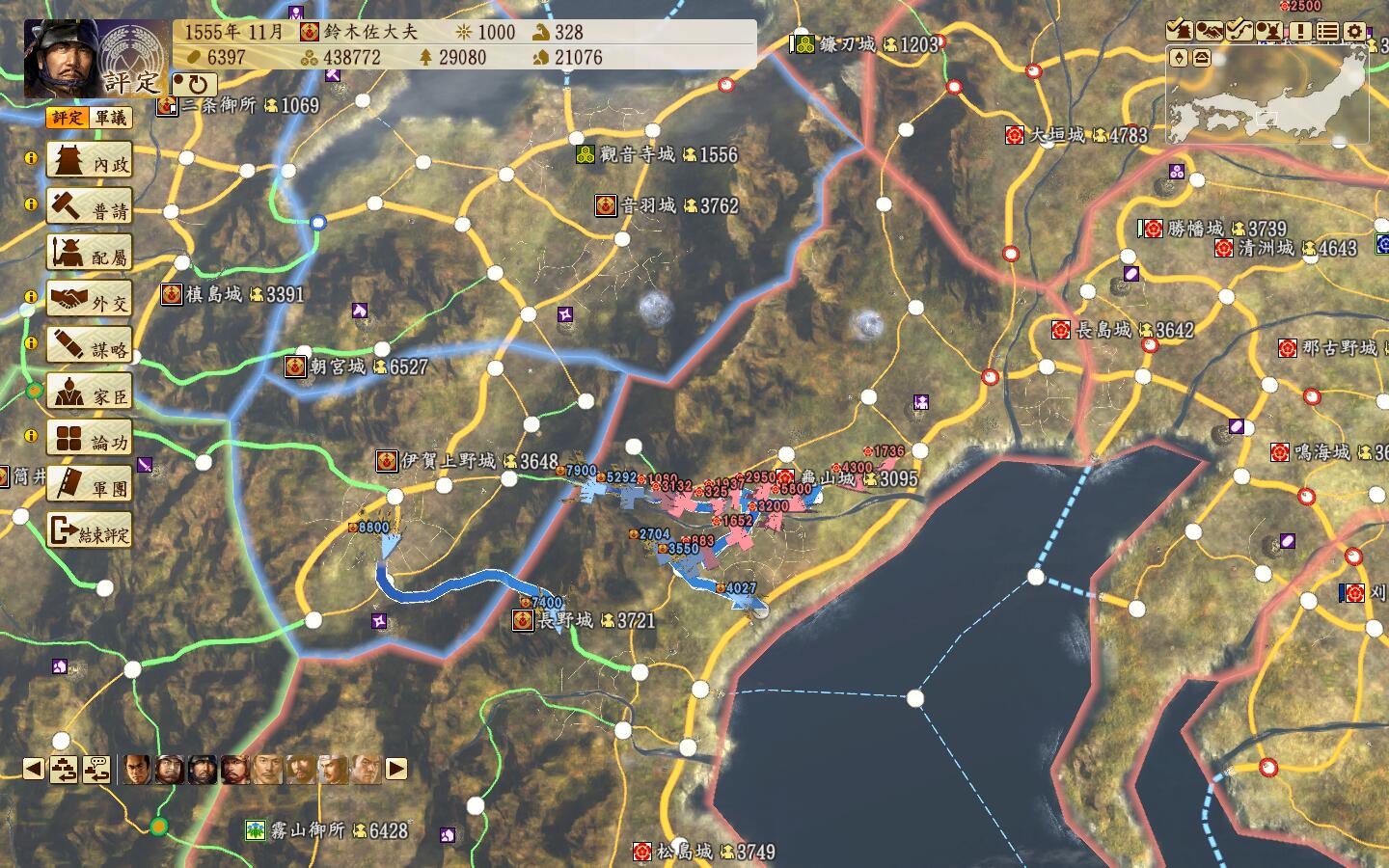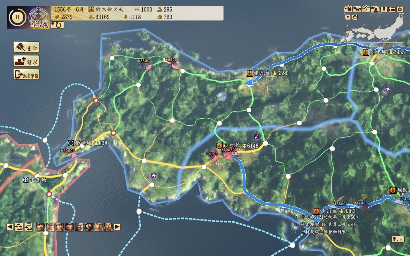 开夫役强化,改修铁城门,杂贺城耐久+3000,降低ai来攻的可能。然后2人分2队一起出门偷四国的安艺城和香宗城