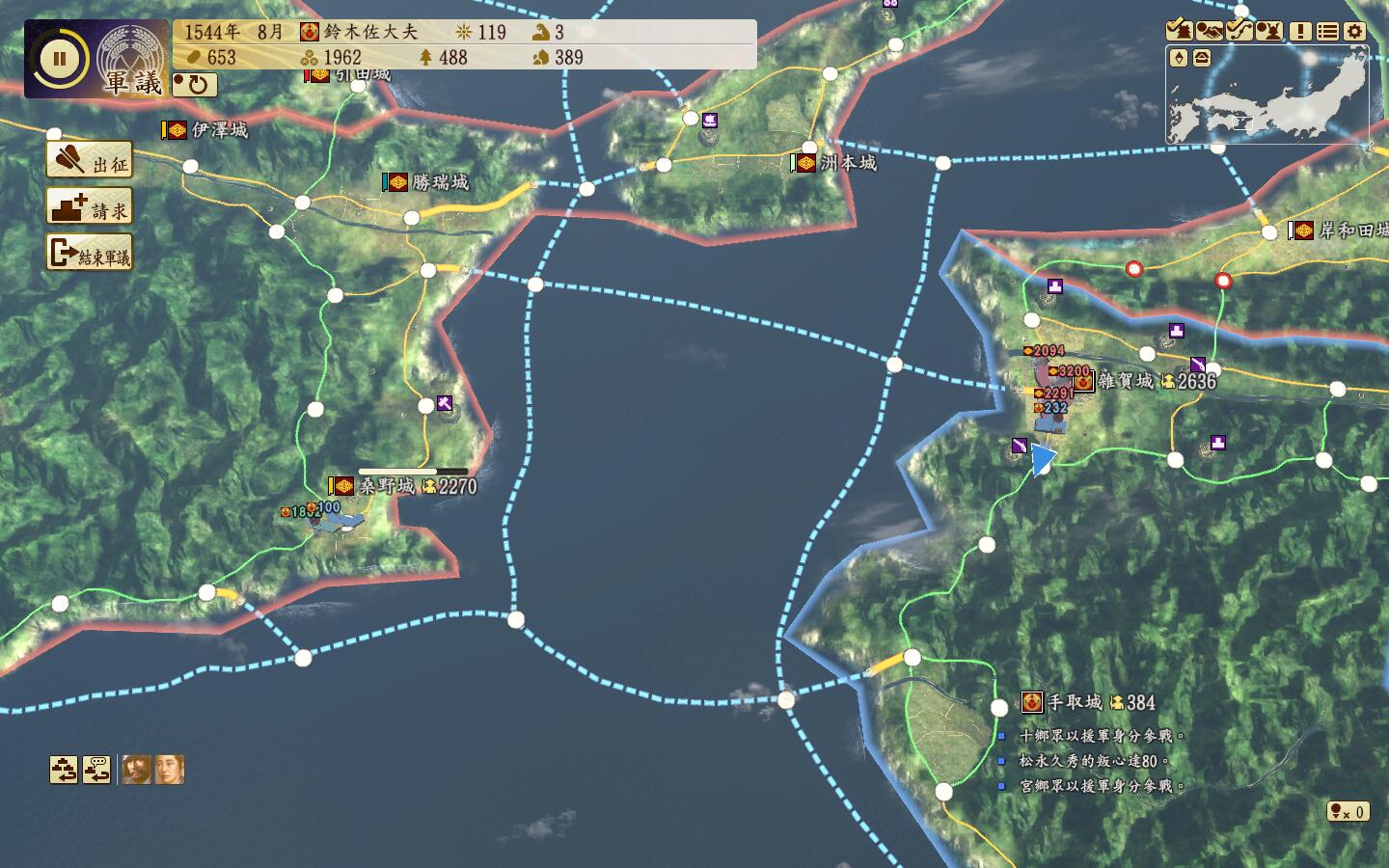 细川家也忍不住去打杂贺城,两线防守,干脆去偷一下桑野,拿点兵去救援,因为我选的难度太高,兵力恢复慢……
