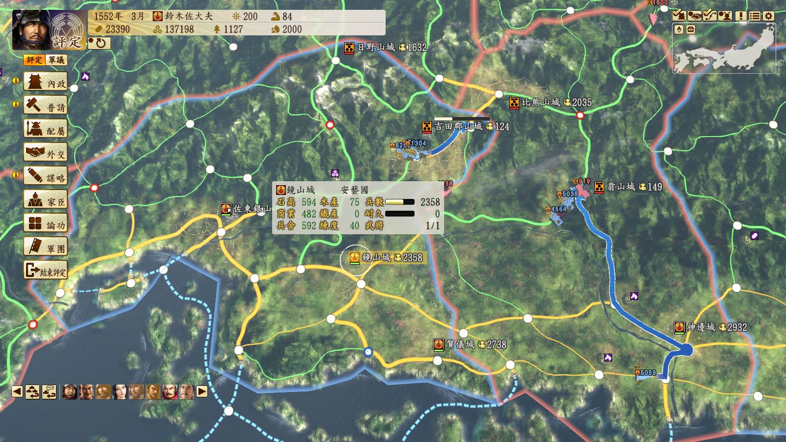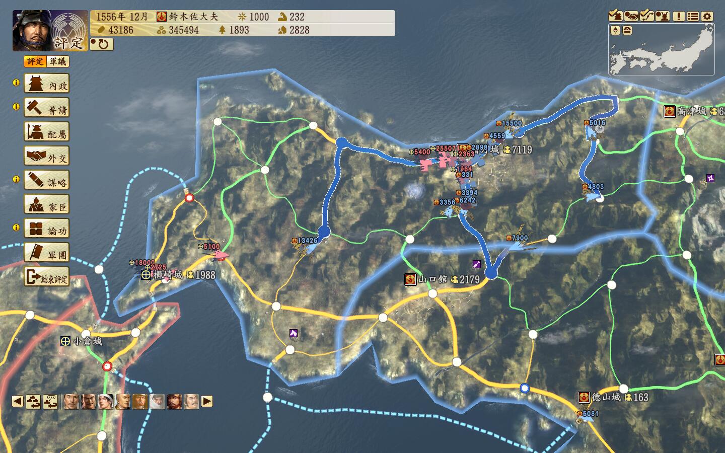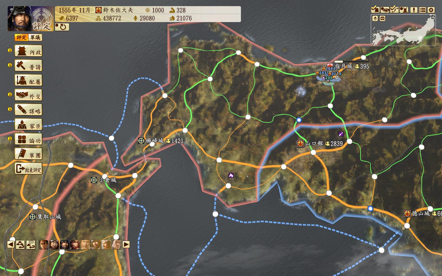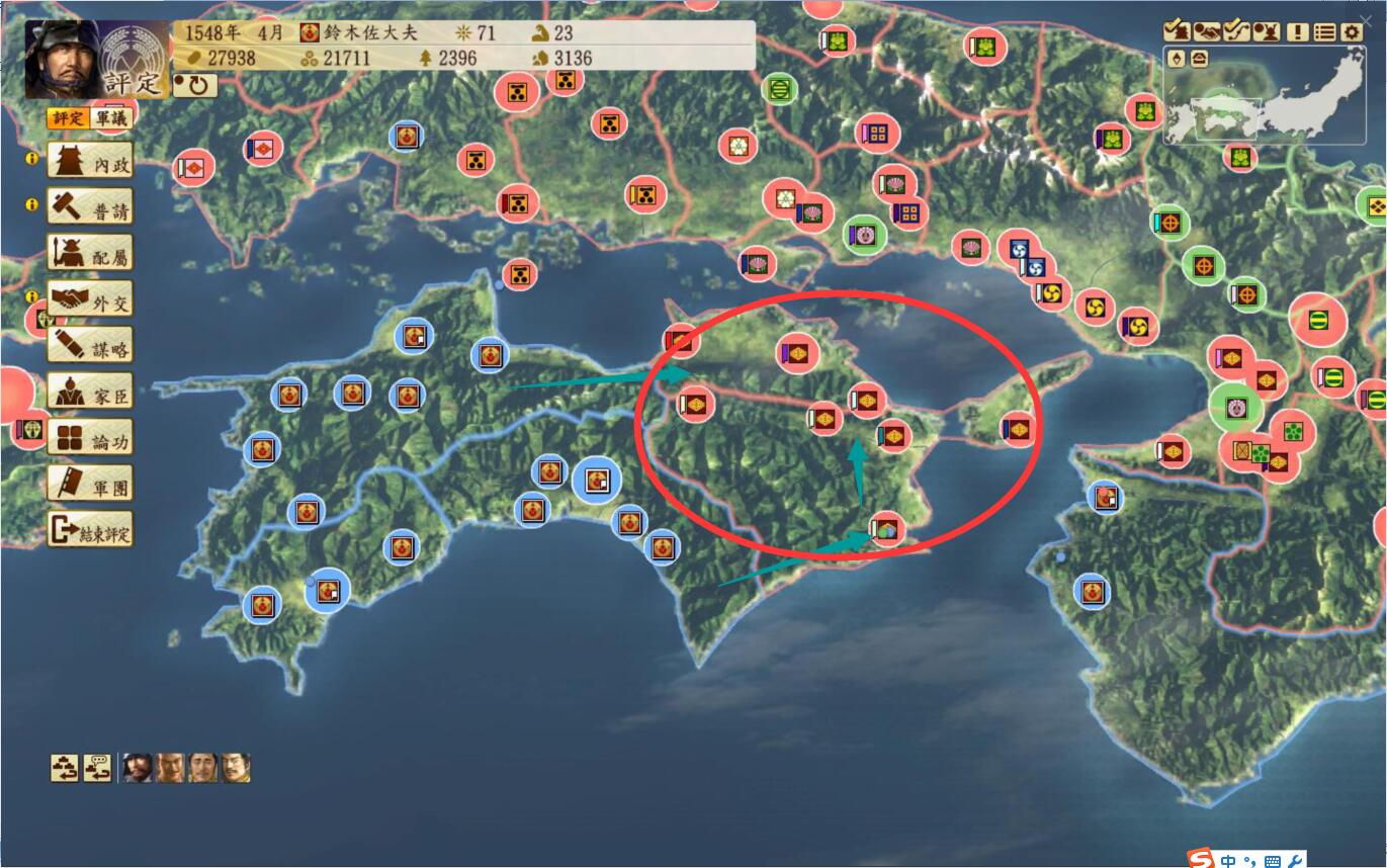 山阳地区是一个适合种田的地方,以佐东银山城-有冈城一条狭长的地带,大多数城都有15区划(黑圈标记),战略方向则是从山阴地区一直扫到二条御所