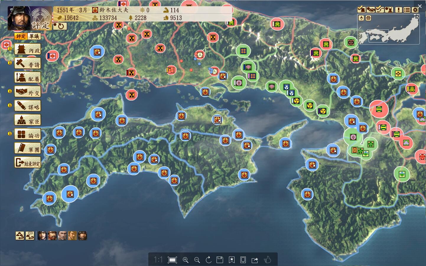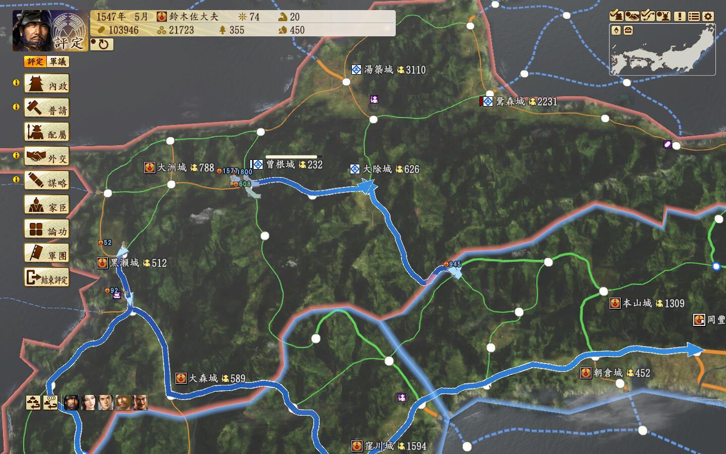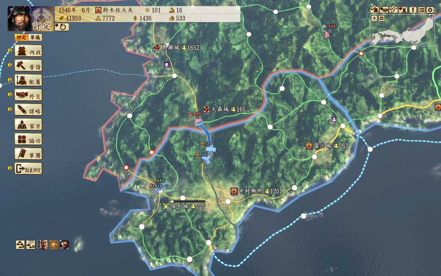 山阳地区是一个适合种田的地方,以佐东银山城-有冈城一条狭长的地带,大多数城都有15区划(黑圈标记),战略方向则是从山阴地区一直扫到二条御所