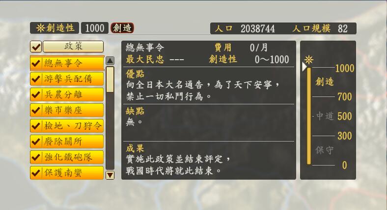 1555年3月左右,创造性到900,可以开兵农分离,全力爆武家町,用裁判所特化(先要奖励总规),此时寺町不需要造了,铺水田和武家町即可。