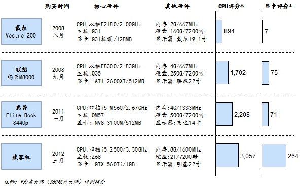最近整理了手头有的几台电脑,有单位的,父母家的,以及自己的新旧两台电脑。做了个表格回顾一下。说起来买过/用过许多电脑了。之前长期使用过的还有单位的3台笔记本,自己购买的两台台式以及一台笔记本。因为都不在身边了,所以也没有数据回顾。记得第一台电脑还是奔II 333,32MB的内存,4.3GB的硬盘,15寸的彩显,卧式的机箱。买价和我目前最新的拼装的台式机也差不多。