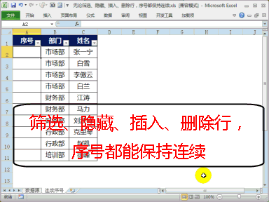 » Excel演示无论筛选、隐藏、插入、删除行,序号都能保持连续