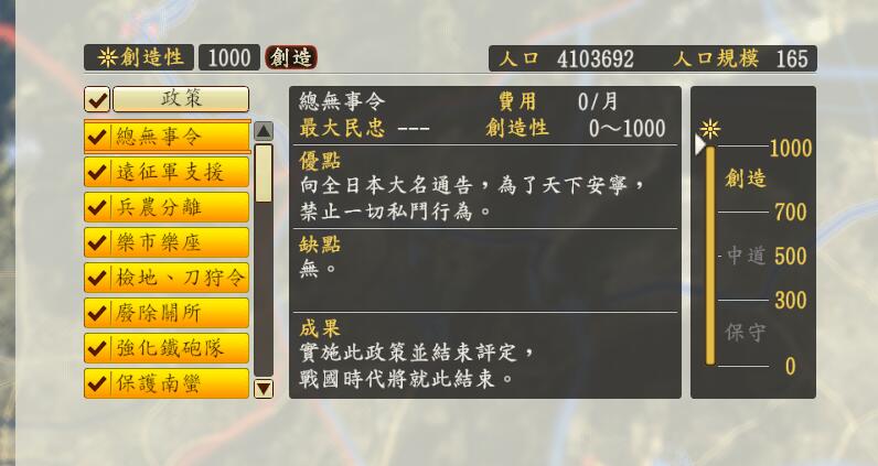 中道开家臣集住+40%常备兵,总的来说除了四公六民,中道大多数政策都不错