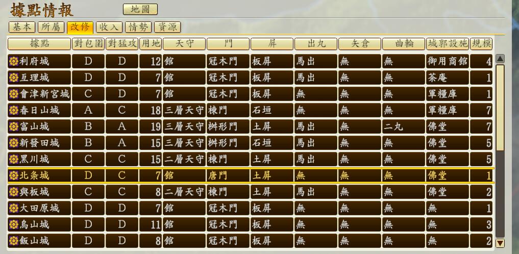 当开了兵农分离后,寺町围着大圣堂建设就可以改了,用武家町围着检断所(裁判所)建,此时直接爆兵舍即可,这么多的军粮库和支城足够养起主力十几支几万人的部队